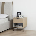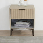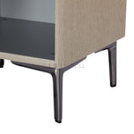 This modern two-level cabinet features a sleek oak woodgrain finish with durable vinyl surfaces and sturdy silver metal legs. Offering both pull-out drawers (upper level) and open storage (lower level), it provides versatile organization with scratch/heat/water resistance.
