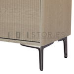 This modern TV stand features a durable oak woodgrain vinyl finish with sturdy black metal legs. its waterproof and heat-resistant MDF construction combines sleek aesthetics with practical cable management.
